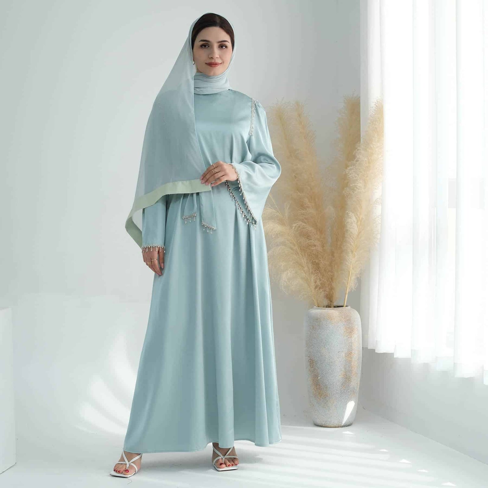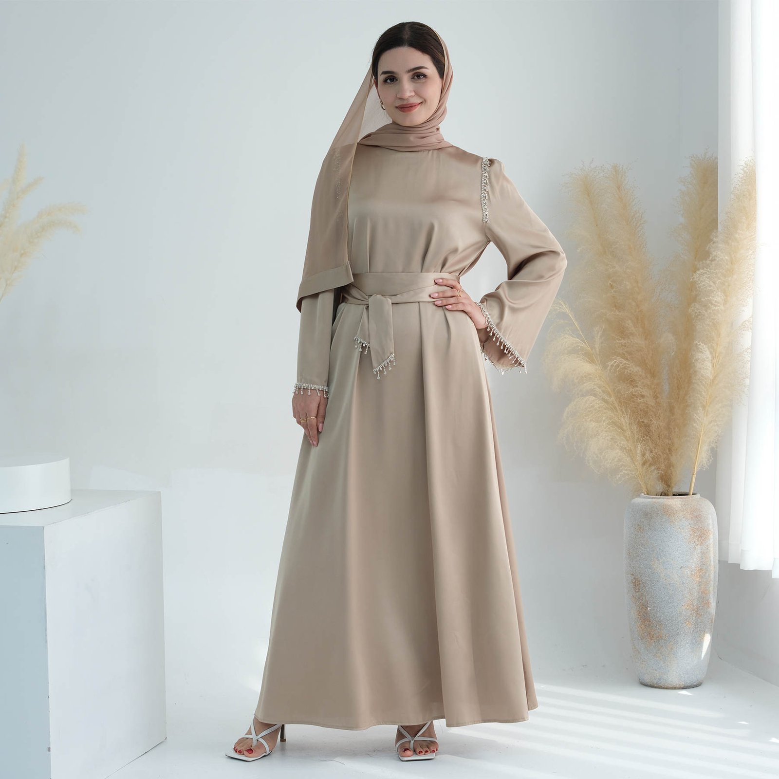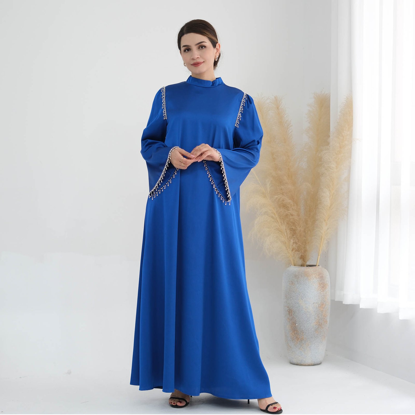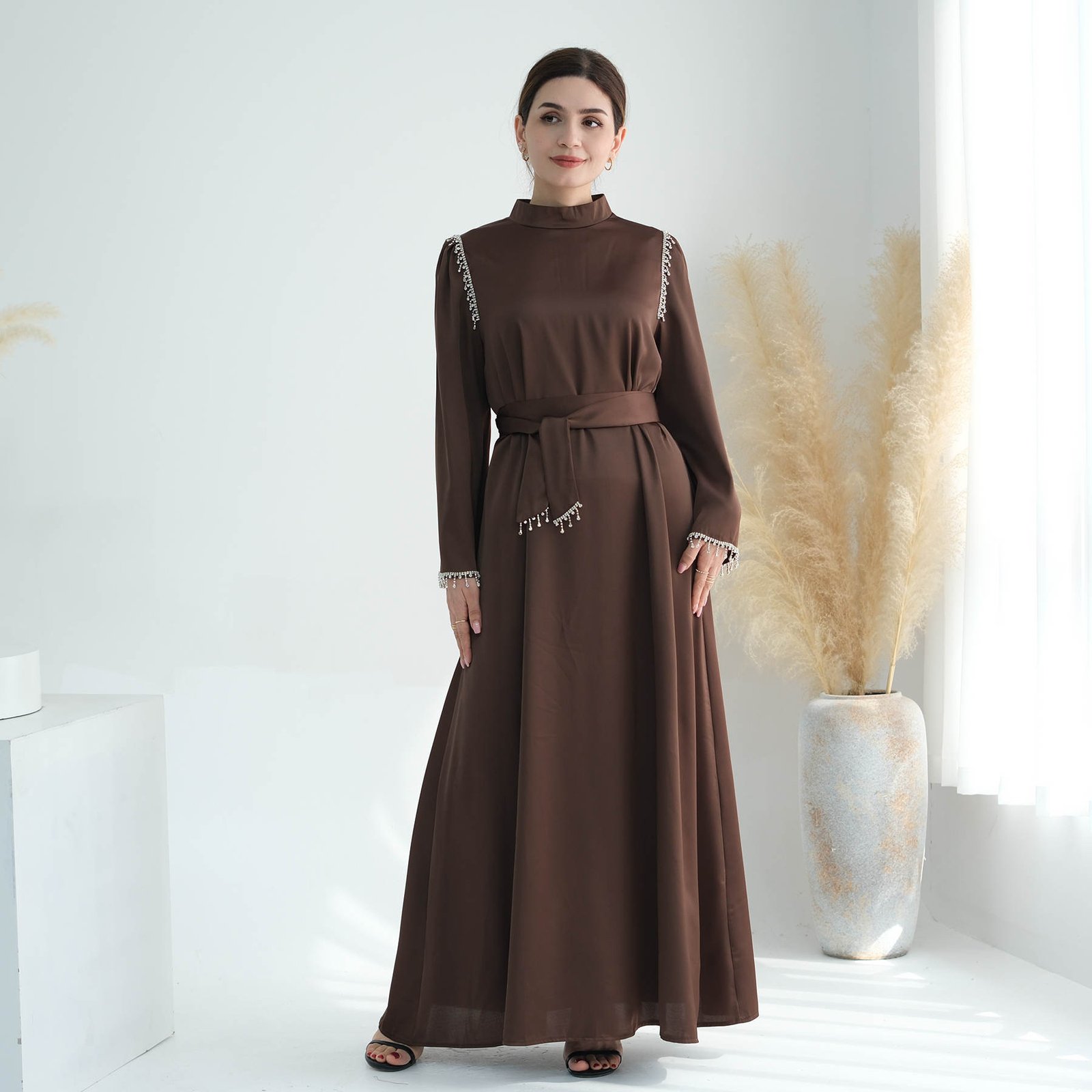 A satin maxi dress with silver embellishments would be equally elegant and striking. The silver embellishments would add a touch of glamour and sparkle, perfect for making a statement at any formal event or evening affair.
