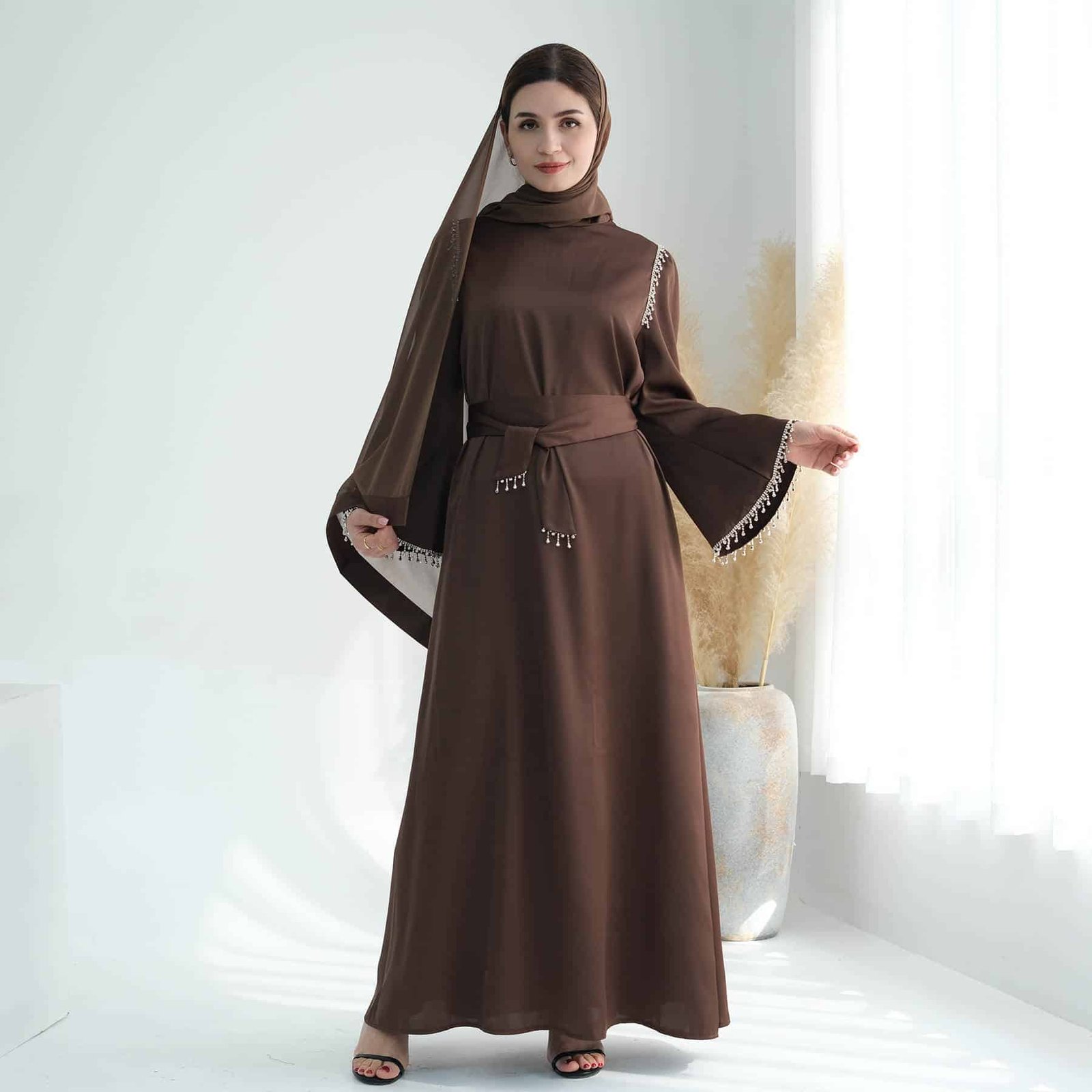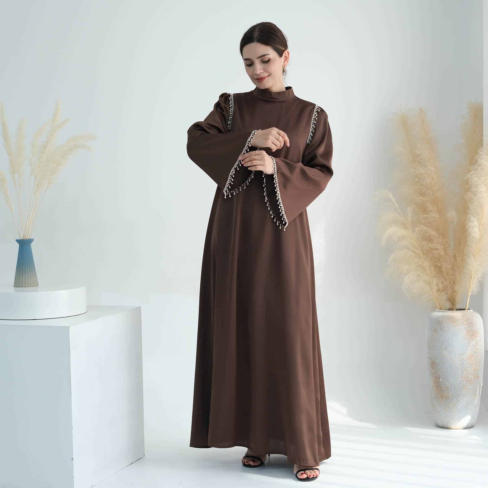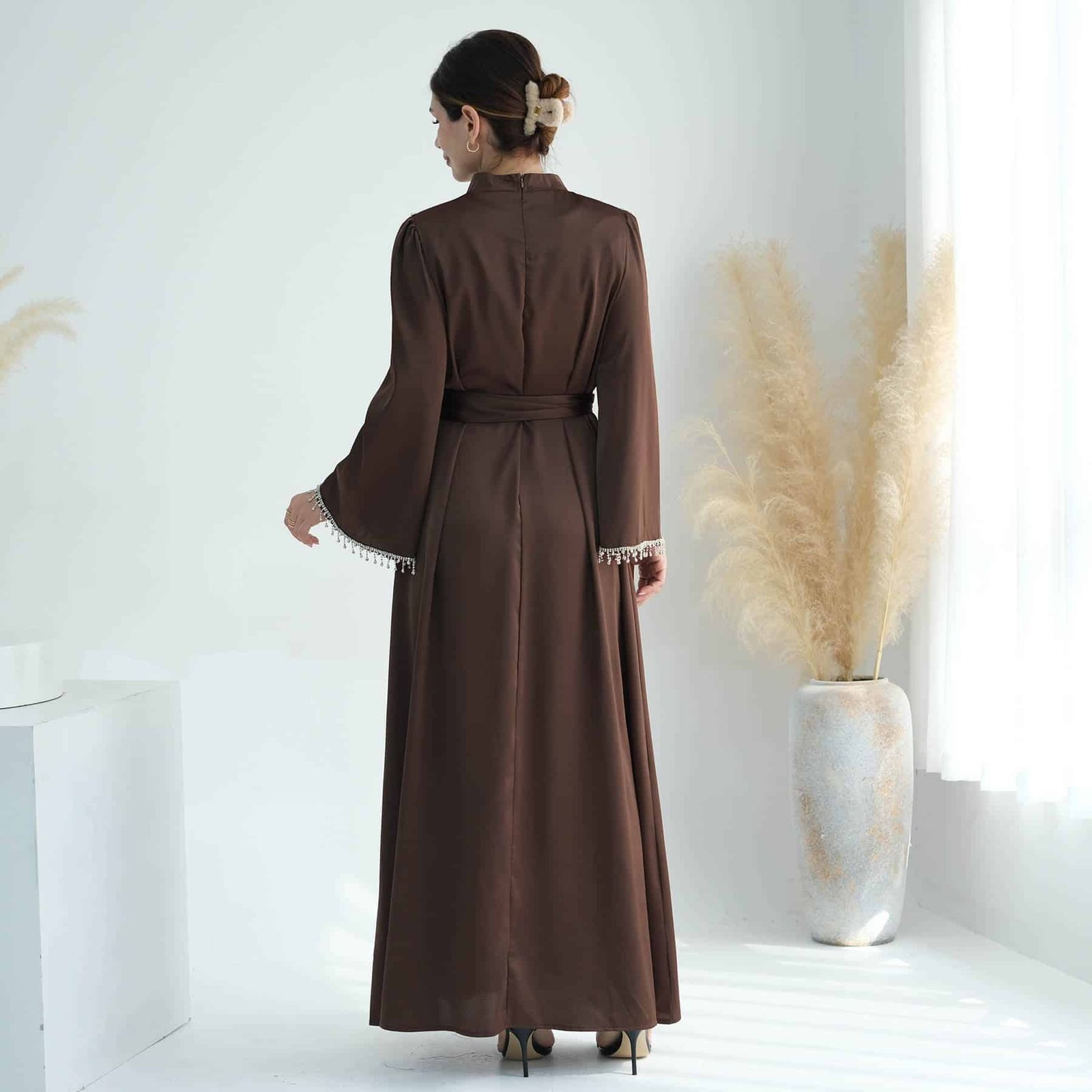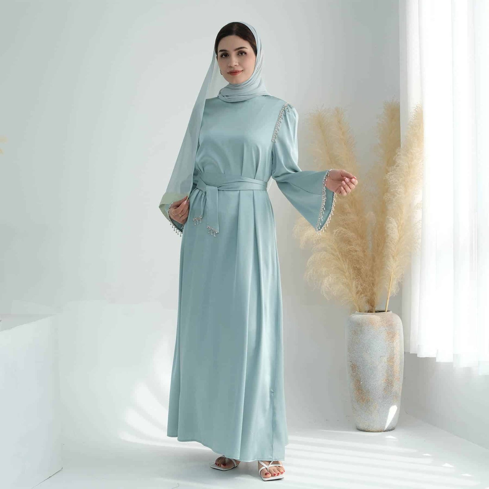 A satin maxi dress with silver embellishments would be equally elegant and striking. The silver embellishments would add a touch of glamour and sparkle, perfect for making a statement at any formal event or evening affair.